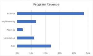Program Revenue was, not surprisingly, a source of funding for 47% of respondents, with 13% implementing, 4% planning, and 12% considering seeking Program Revenue. 24% considered it N/A. This is an area for further education and work as there is an opportunity for refined business models to balance Program Revenue with sensitivities to constituent situations, including the possibility of locating third party funders to augment existing revenue streams.